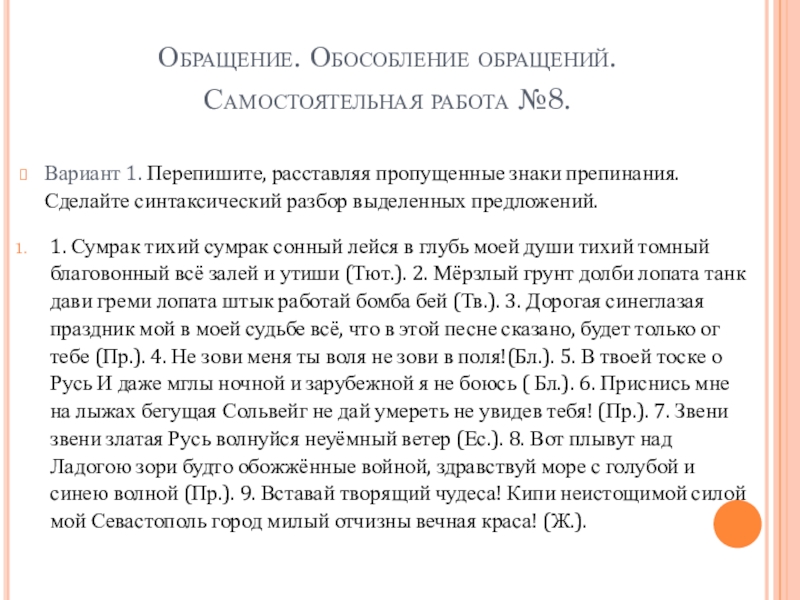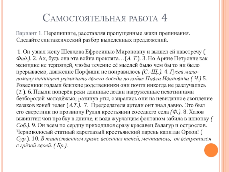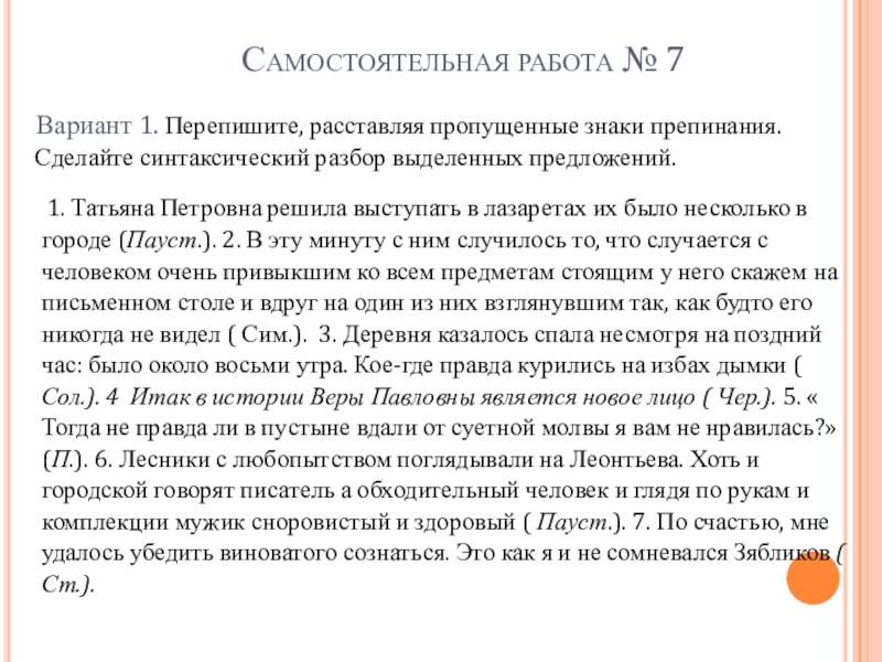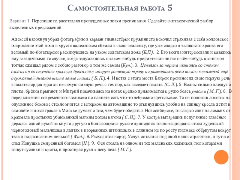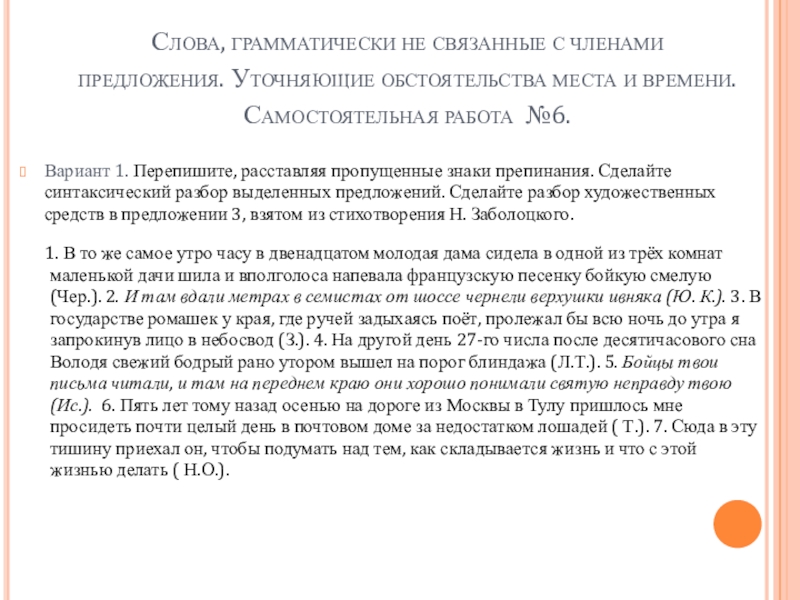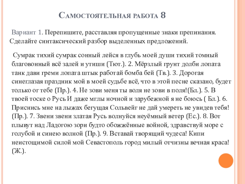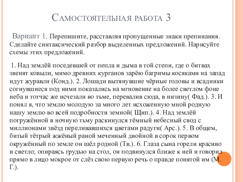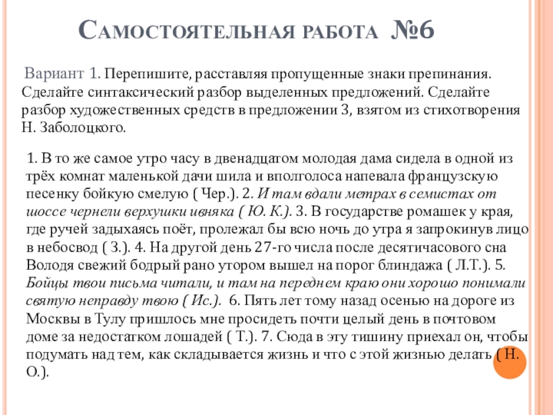Вариант 1. Перепишите, расставляя пропущенные знаки препинания. Сделайте синтаксический разбор выделенных предложений. Сделайте разбор художественных средств в предложении 3, взятом из стихотворения Н. Заболоцкого.