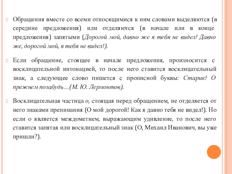 Если обращение, стоящее в начале предложения, произносится с восклицательной интонацией, то после него ставится восклицательный знак, а следующее слово пишется с прописной буквы: Старик! О прежнем позабудь…(М. Ю. Лермонтов).