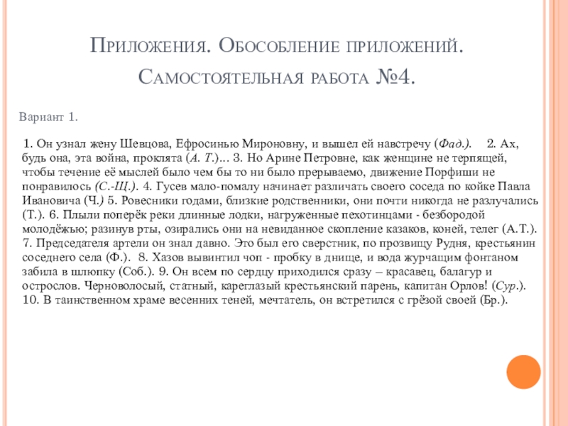 Он узнал жену Шевцова, Ефросинью Мироновну, и вышел ей навстречу (Фад.). 2. Ах, будь она, эта война, проклята (А. Т.)... 3. Но Арине Петровне, как женщине не терпящей, чтобы течение её мыслей было чем бы то ни было прерываемо, движение Порфиши не понравилось (С.-Щ.). 4. Гусев мало-помалу начинает различать своего соседа по койке Павла Ивановича (Ч.) 5. Ровесники годами, близкие родственники, они почти никогда не разлучались (Т.). 6. Плыли поперёк реки длинные лодки, нагруженные пехотинцами - безбородой молодёжью; разинув рты, озирались они на невиданное скопление казаков, коней, телег (А.Т.). 7. Председателя артели он знал давно. Это был его сверстник, по прозвищу Рудня, крестьянин соседнего села (Ф.). 8. Хазов вывинтил чоп - пробку в днище, и вода журчащим фонтаном забила в шлюпку (Соб.). 9. Он всем по сердцу приходился сразу – красавец, балагур и острослов. Черноволосый, статный, кареглазый крестьянский парень, капитан Орлов! (Сур.). 10. В таинственном храме весенних теней, мечтатель, он встретился с грёзой своей (Бр.).