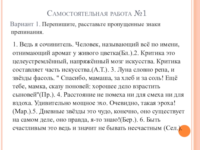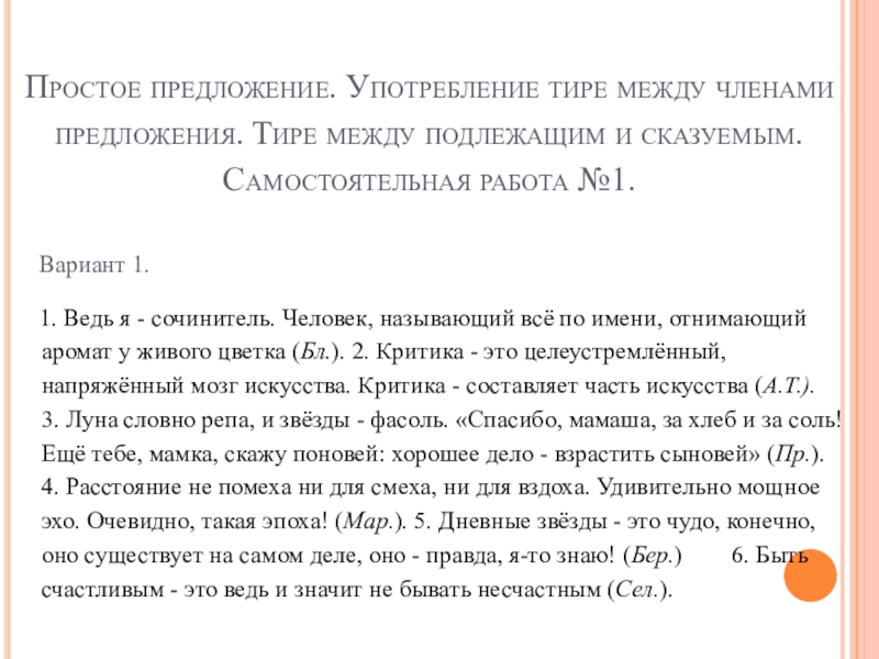1. Ведь я - сочинитель. Человек, называющий всё по имени, отнимающий аромат у живого цветка (Бл.). 2. Критика - это целеустремлённый, напряжённый мозг искусства. Критика - составляет часть искусства (А.Т.). 3. Луна словно репа, и звёзды - фасоль. «Спасибо, мамаша, за хлеб и за соль! Ещё тебе, мамка, скажу поновей: хорошее дело - взрастить сыновей» (Пр.). 4. Расстояние не помеха ни для смеха, ни для вздоха. Удивительно мощное эхо. Очевидно, такая эпоха! (Мар.). 5. Дневные звёзды - это чудо, конечно, оно существует на самом деле, оно - правда, я-то знаю! (Бер.) 6. Быть счастливым - это ведь и значит не бывать несчастным (Сел.).