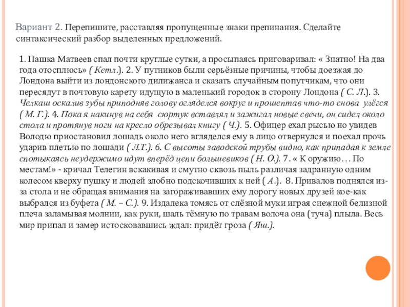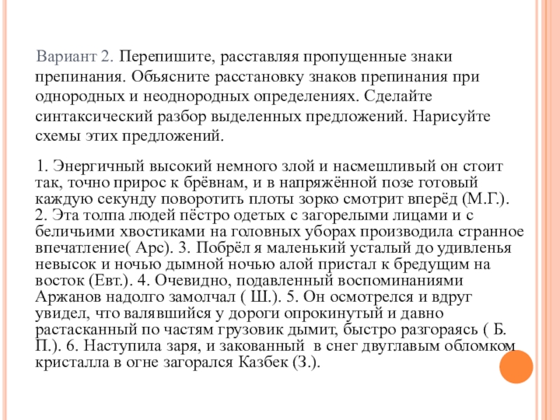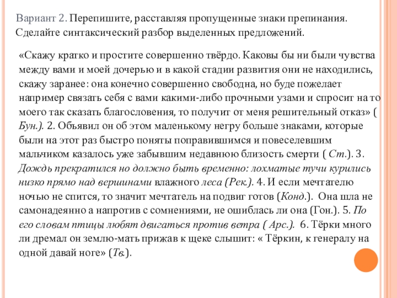 Слайд 67Вариант 2. Перепишите, расставляя пропущенные знаки препинания. Сделайте синтаксический разбор выделенных