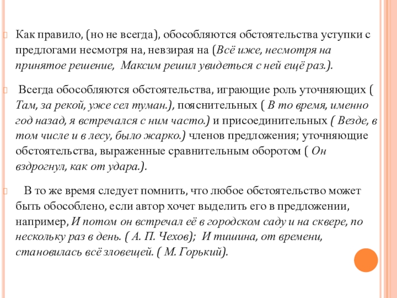 «Скажу кратко и простите совершенно твёрдо. Каковы бы ни были чувства между вами и моей дочерью и в какой стадии развития они не находились, скажу заранее: она конечно совершенно свободна, но буде пожелает например связать себя с вами какими-либо прочными узами и спросит на то моего так сказать благословения, то получит от меня решительный отказ» ( Бун.). 2. Объявил он об этом маленькому негру больше знаками, которые были на этот раз быстро поняты поправившимся и повеселевшим мальчиком казалось уже забывшим недавнюю близость смерти ( Ст.). 3. Дождь прекратился но должно быть временно: лохматые тучи курились низко прямо над вершинами влажного леса (Рек.). 4. И если мечтателю ночью не спится, то значит мечтатель на подвиг готов (Конд.). Она шла не самонадеянно а напротив с сомнениями, не ошиблась ли она (Гон.). 5. По его словам птицы любят двигаться против ветра ( Арс.). 6. Тёрки много ли дремал он землю-мать прижав к щеке слышит: « Тёркин, к генералу на одной давай ноге» (Тв.).