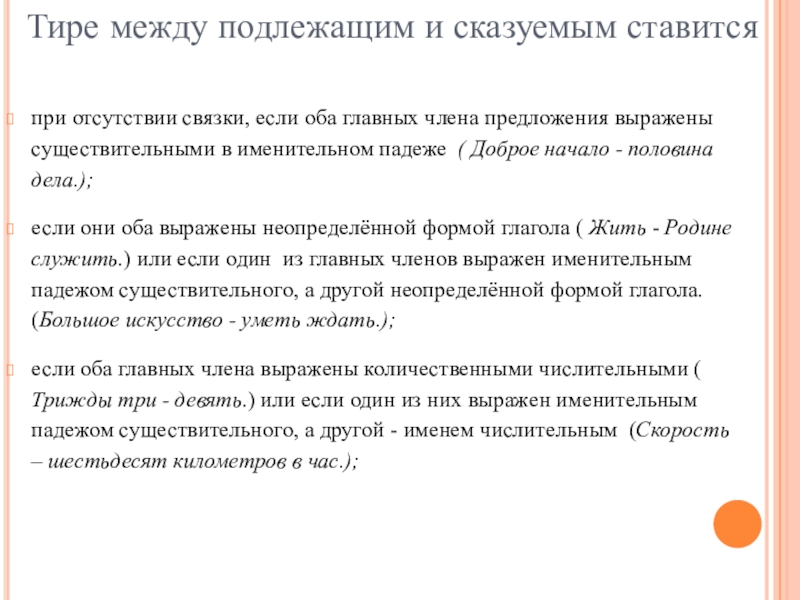 если они оба выражены неопределённой формой глагола ( Жить - Родине служить.) или если один из главных членов выражен именительным падежом существительного, а другой неопределённой формой глагола. (Большое искусство - уметь ждать.);