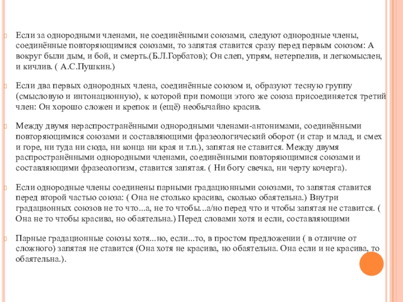 Если за однородными членами, не соединёнными союзами, следуют однородные члены, соединённые