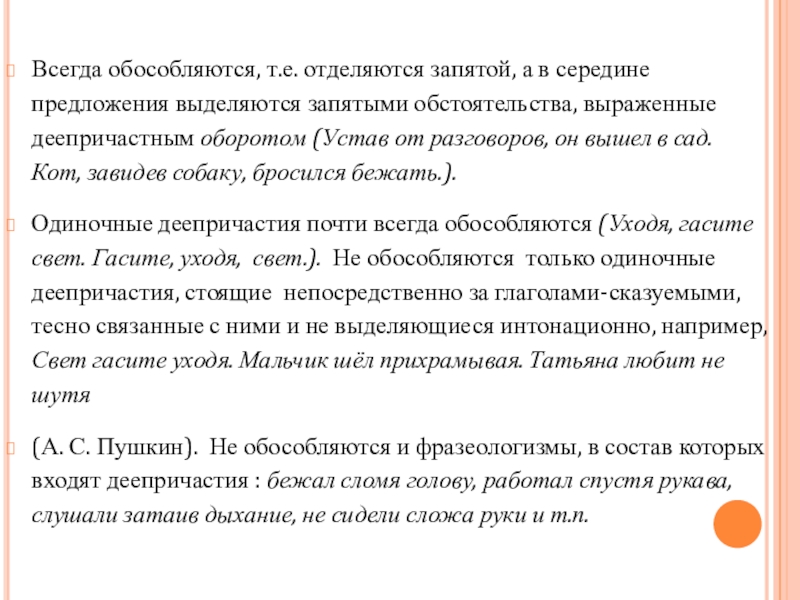 1. Пашка Матвеев спал почти круглые сутки, а просыпаясь приговаривал: « Знатно! На два года отосплюсь» ( Кетл.). 2. У путников были серьёзные причины, чтобы доезжая до Лондона выйти из лондонского дилижанса и сказать случайным попутчикам, что они пересядут в почтовую карету идущую в маленький городок в сторону Лондона ( С. Л.). 3. Челкаш оскалив зубы приподняв голову огляделся вокруг и прошептав что-то снова улёгся ( М. Г.). 4. Пока я накинув на себя сюртук вставлял и зажигал новые свечи, он сидел около стола и протянув ноги на кресло обрезывал книгу ( Ч.). 5. Офицер ехал рысью но увидев Володю приостановил лошадь около него вгляделся ему в лицо отвернулся и поехал прочь ударив плетью по лошади ( Л.Т.). 6. С высоты заводской трубы видно, как припадая к земле спотыкаясь неудержимо идут вперёд цепи большевиков ( Н. О.). 7. « К оружию… По местам!» - кричал Телегин вскакивая и смутно сквозь пыль различая задранную одним колесом кверху пушку и людей злобно подскочивших к ней ( А.). 8. Привалов поднялся из-за стола и не обращая внимания на загораживавших ему дорогу новых друзей кое-как выбрался из буфета ( М. – С.). 9. Издалека томясь от слёзной муки играя снежной белизной плеча заламывая молнии, как руки, шаль тёмную по травам волоча она (туча) плыла. Весь мир припал и замер истосковавшись ждал: придёт гроза ( Яш.).