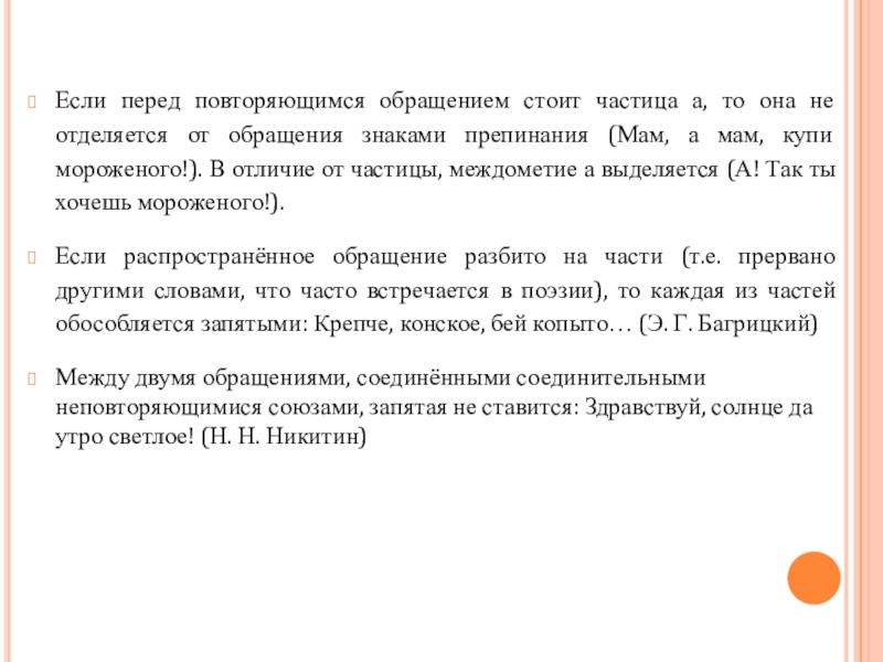 Если распространённое обращение разбито на части (т.е. прервано другими словами, что часто встречается в поэзии), то каждая из частей обособляется запятыми: Крепче, конское, бей копыто… (Э. Г. Багрицкий)