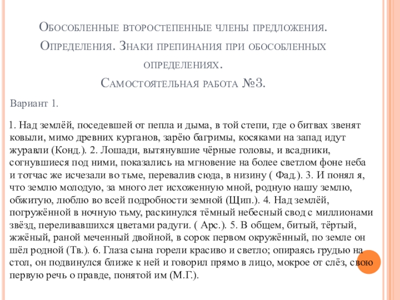 1. Над землёй, поседевшей от пепла и дыма, в той степи, где о битвах звенят ковыли, мимо древних курганов, зарёю багримы, косяками на запад идут журавли (Конд.). 2. Лошади, вытянувшие чёрные головы, и всадники, согнувшиеся под ними, показались на мгновение на более светлом фоне неба и тотчас же исчезали во тьме, перевалив сюда, в низину ( Фад.). 3. И понял я, что землю молодую, за много лет исхоженную мной, родную нашу землю, обжитую, люблю во всей подробности земной (Щип.). 4. Над землёй, погружённой в ночную тьму, раскинулся тёмный небесный свод с миллионами звёзд, переливавшихся цветами радуги. ( Арс.). 5. В общем, битый, тёртый, жжёный, раной меченный двойной, в сорок первом окружённый, по земле он шёл родной (Тв.). 6. Глаза сына горели красиво и светло; опираясь грудью на стол, он подвинулся ближе к ней и говорил прямо в лицо, мокрое от слёз, свою первую речь о правде, понятой им (М.Г.).