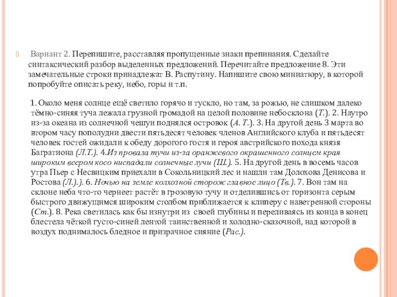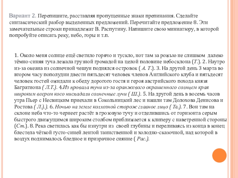 синтаксический разбор выделенных предложений. Перечитайте предложение 8. Эти замечательные строки принадлежат В. Распутину. Напишите свою миниатюру, в которой попробуйте описать реку, небо, горы и т.п.