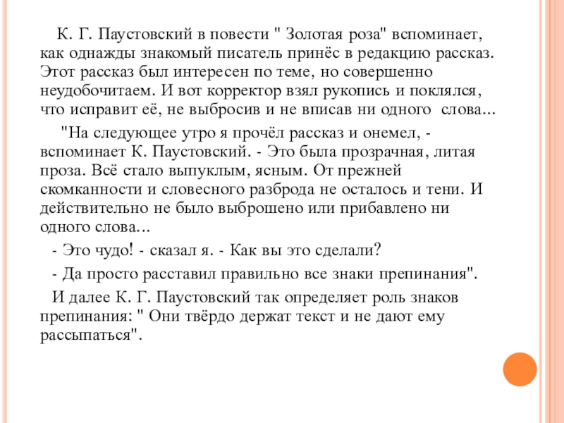 И далее К. Г. Паустовский так определяет роль знаков препинания: " Они твёрдо держат текст и не дают ему рассыпаться".