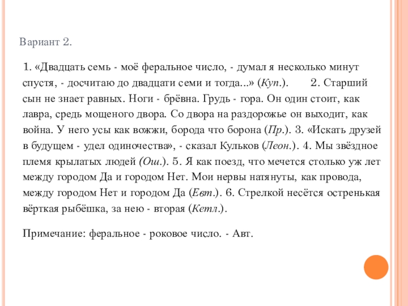 " Двадцать семь моё феральное число, - думал я несколько минут спустя, - досчитаю до двадцати семи и тогда..."(Куп.). 2. Старший сын не знает равных. Ноги брёвна. Грудь гора. Он один стоит, как лавра, средь мощеного двора. Со двора на раздорожье он выходит как война. У него усы как вожжи, борода что борона(Пр.). 3. " Искать друзей в будущем удел одиночества", - сказал Кульков(Леон.). 4. Мы звёздное племя крылатых людей (Ош.). 5. Я как поезд, что мечется столько уж лет между городом Да и городом Нет. Мои нервы натянуты, как провода, между городом Нет и городом Да(Евт.). 6. Стрелкой несётся остренькая вёрткая рыбёшка, за нею вторая(Кетл.).