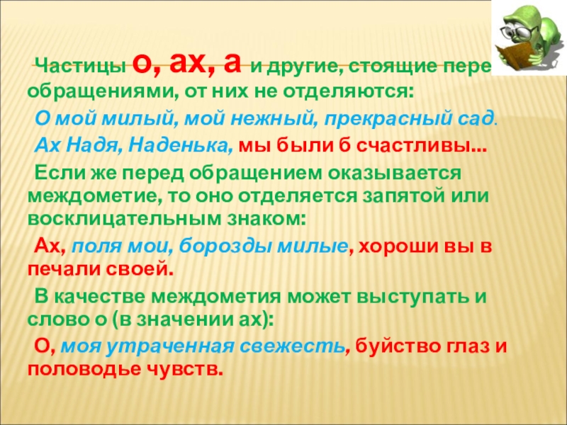 Слайд 7 Частицы о, ах, а и другие, стоящие перед обращениями, от них