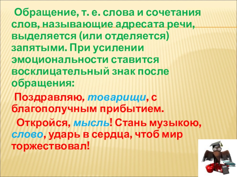 Слайд 2 Обращение, т. е. слова и сочетания слов, называющие адресата речи, выделяется