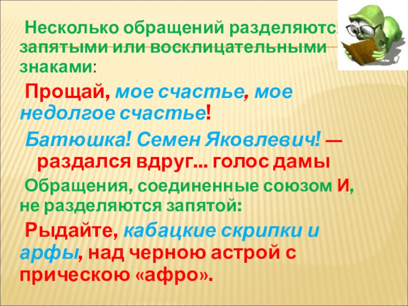 (или отделяется) запятыми. При усилении эмоциональности ставится восклицательный знак после обращения: