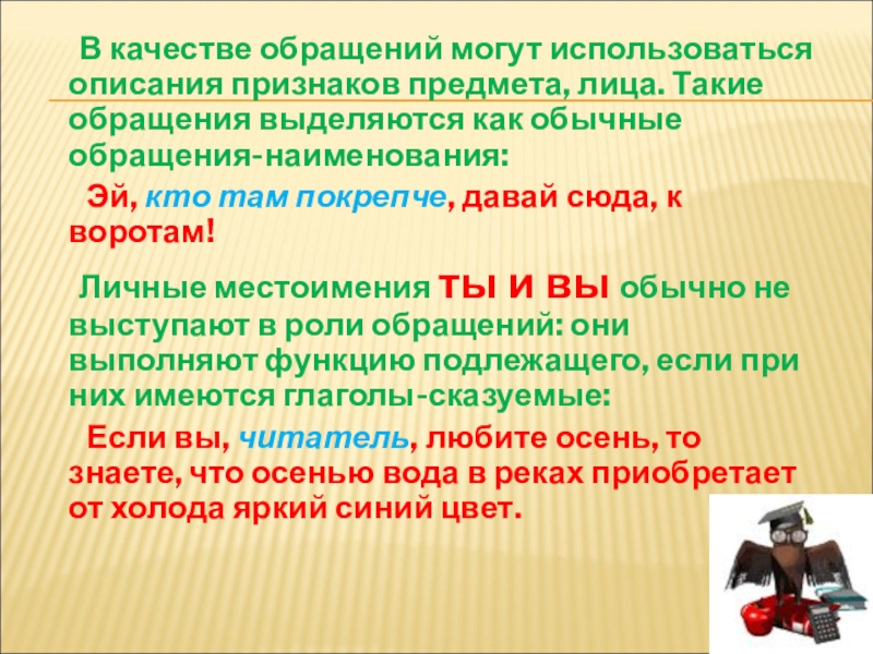 Слайд 6 В качестве обращений могут использоваться описания признаков предмета, лица. Такие обращения