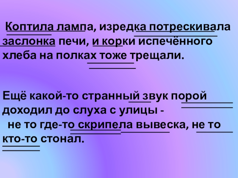 Коптила лампа, изредка потрескивала заслонка печи, и корки испечённого хлеба на полках тоже трещали.