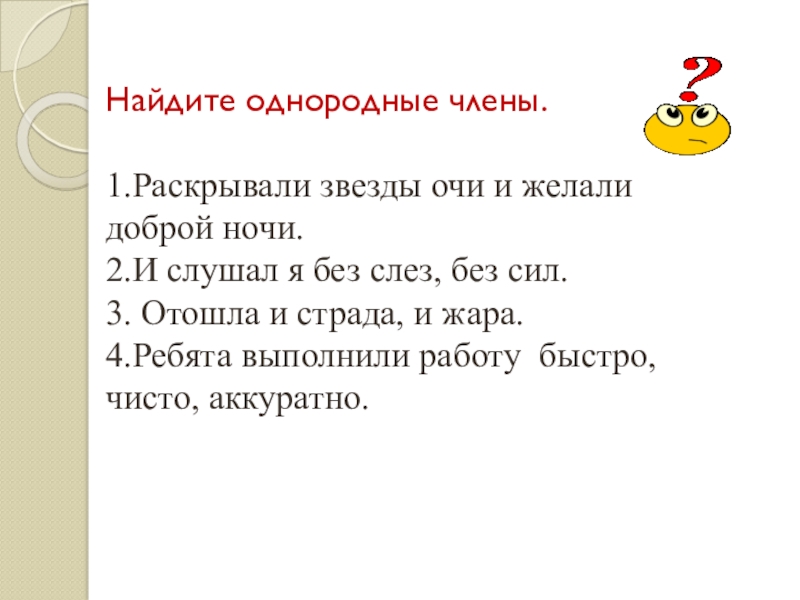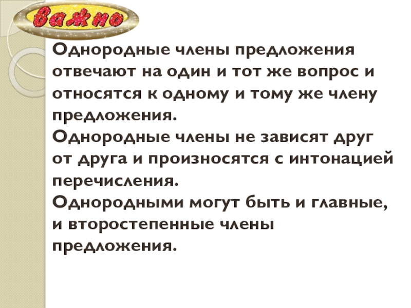 Слайд 7Однородные члены предложения отвечают на один и тот же вопрос и