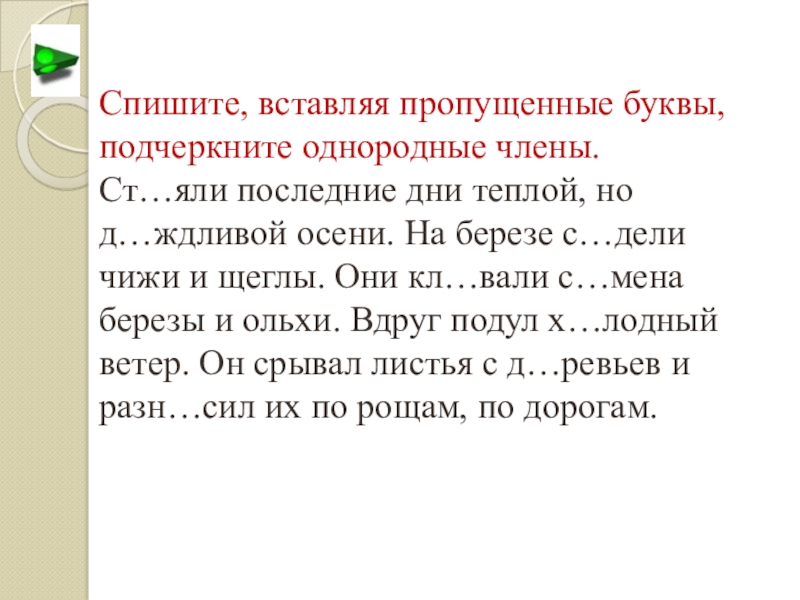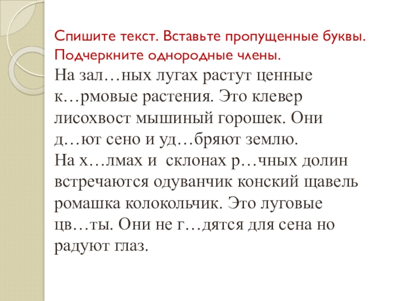 Слайд 19Спишите текст. Вставьте пропущенные буквы. Подчеркните однородные члены.