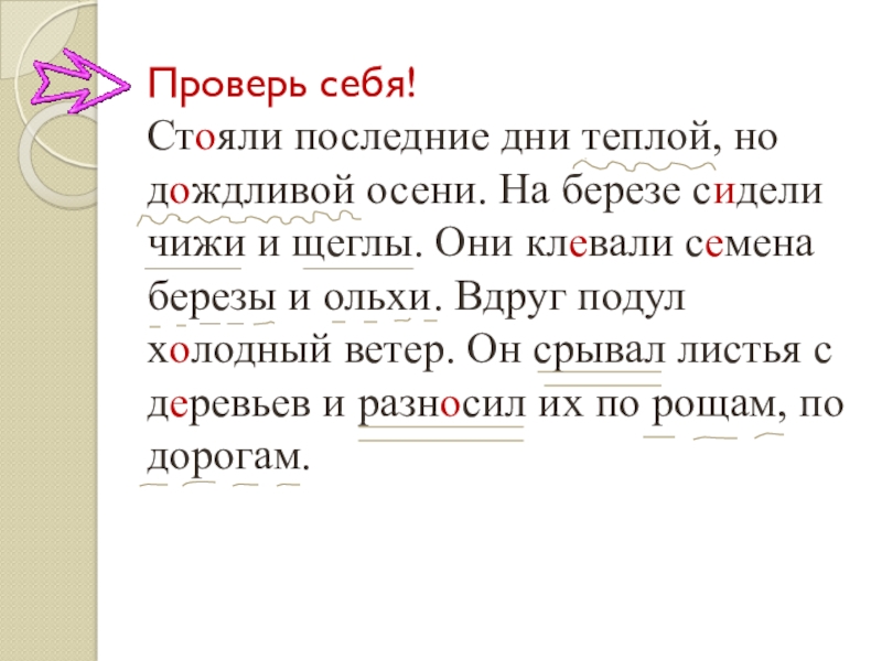 д…ждливой осени. На березе с…дели чижи и щеглы. Они кл…вали с…мена березы и ольхи. Вдруг подул х…лодный ветер. Он срывал листья с д…ревьев и разн…сил их по рощам, по дорогам.