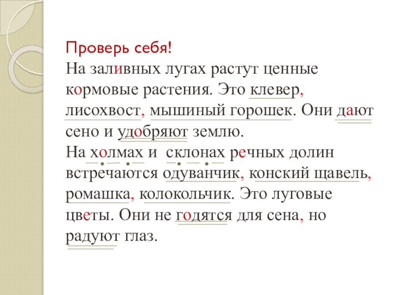 На х…лмах и склонах р…чных долин встречаются одуванчик конский щавель ромашка колокольчик. Это луговые цв…ты. Они не г…дятся для сена но радуют глаз.