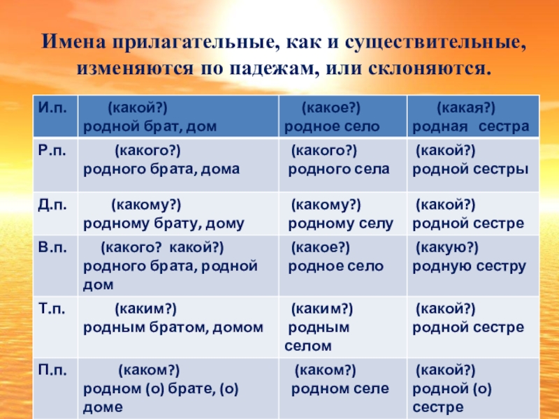 Слайд 10Имена прилагательные, как и существительные, изменяются по падежам, или склоняются.