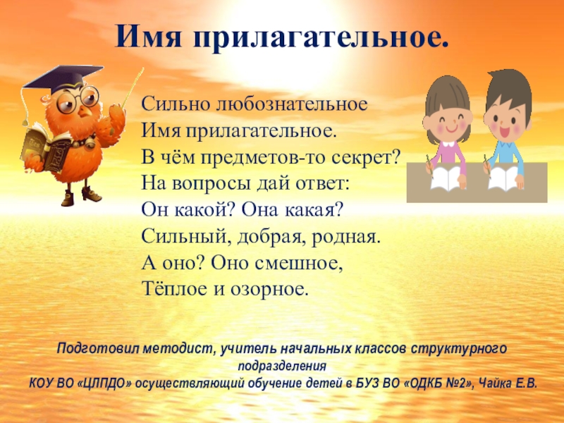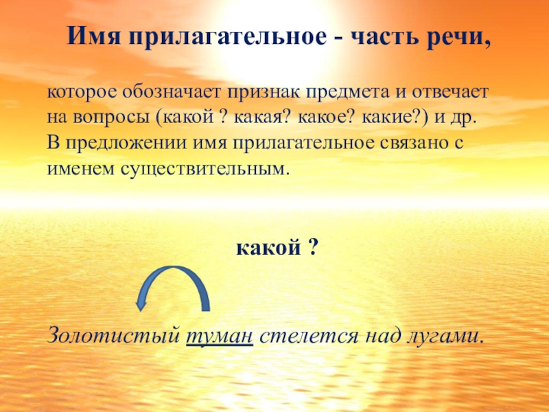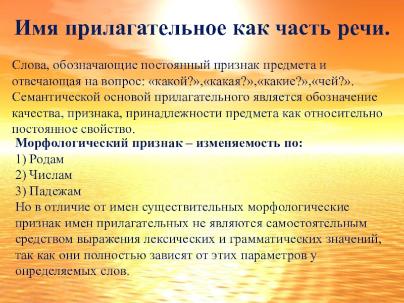на вопрос: «какой?»,«какая?»,«какие?»,«чей?». Семантической основой прилагательного является обозначение качества, признака, принадлежности предмета как относительно постоянное свойство.
