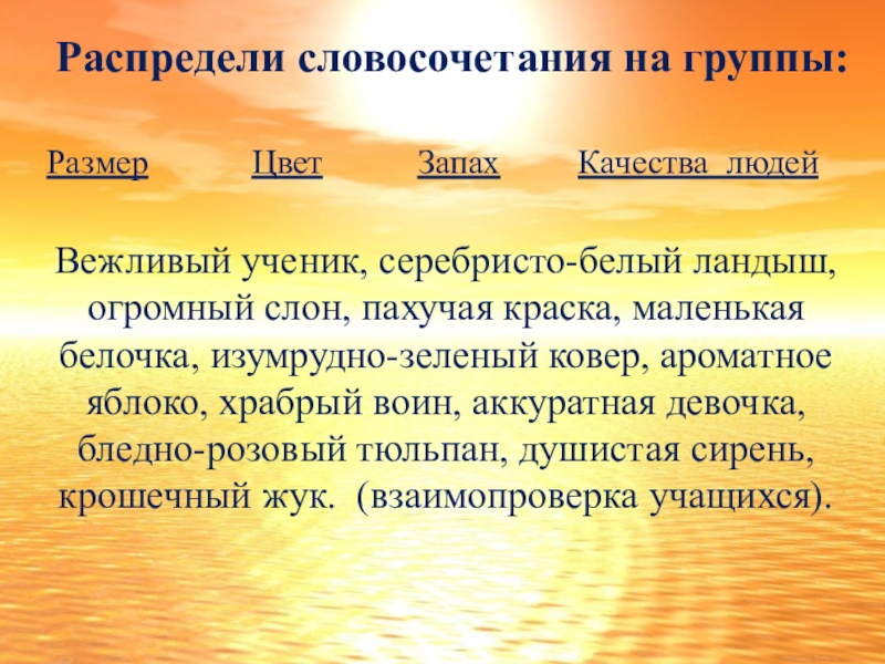 Вежливый ученик, серебристо-белый ландыш, огромный слон, пахучая краска, маленькая белочка, изумрудно-зеленый ковер, ароматное яблоко, храбрый воин, аккуратная девочка, бледно-розовый тюльпан, душистая сирень, крошечный жук. (взаимопроверка учащихся).