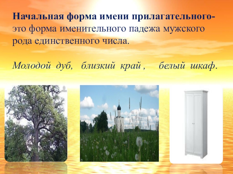 Слайд 13Начальная форма имени прилагательного- это форма именительного падежа мужского рода единственного