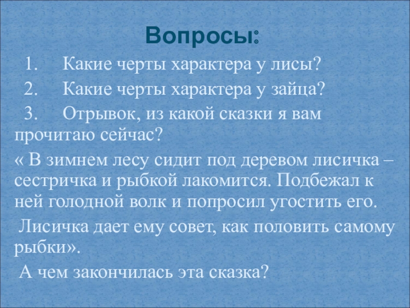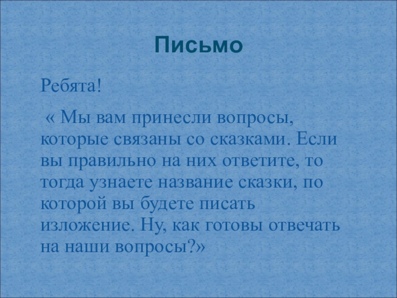 « Мы вам принесли вопросы, которые связаны со сказками. Если вы правильно на них ответите, то тогда узнаете название сказки, по которой вы будете писать изложение. Ну, как готовы отвечать на наши вопросы?»