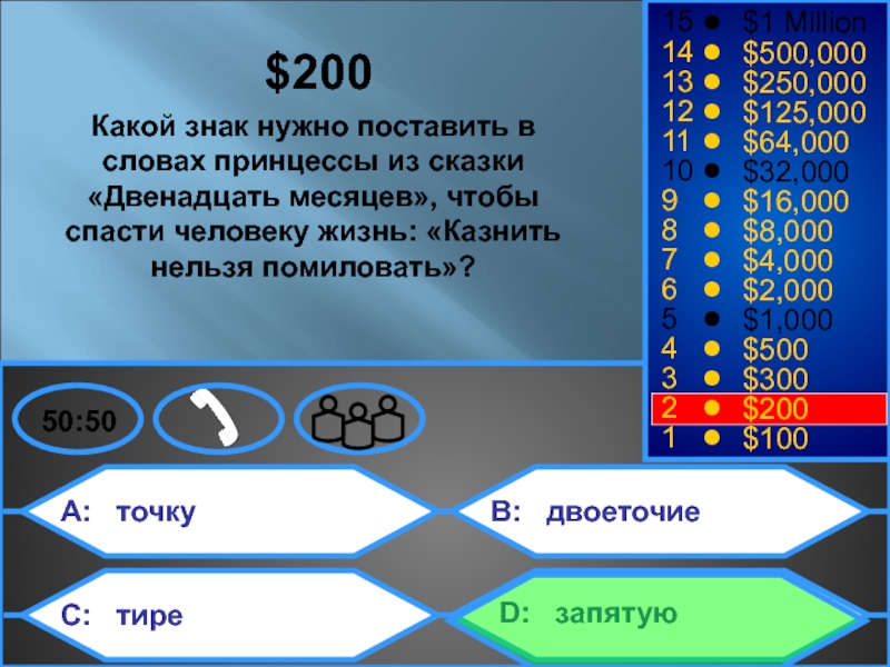 Какой знак нужно поставить в словах принцессы из сказки «Двенадцать месяцев», чтобы спасти человеку жизнь: «Казнить нельзя помиловать»?