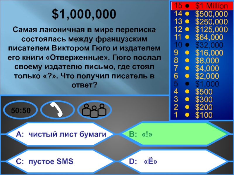 Самая лаконичная в мире переписка состоялась между французским писателем Виктором Гюго и издателем его книги «Отверженные». Гюго послал своему издателю письмо, где стоял только «?». Что получил писатель в ответ?