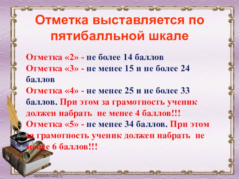 Отметка «5» - не менее 34 баллов. При этом за грамотность ученик должен набрать не менее 6 баллов!!!