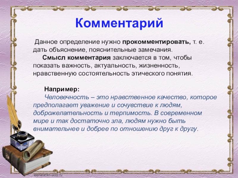 Смысл комментария заключается в том, чтобы показать важность, актуальность, жизненность, нравственную состоятельность этического понятия.