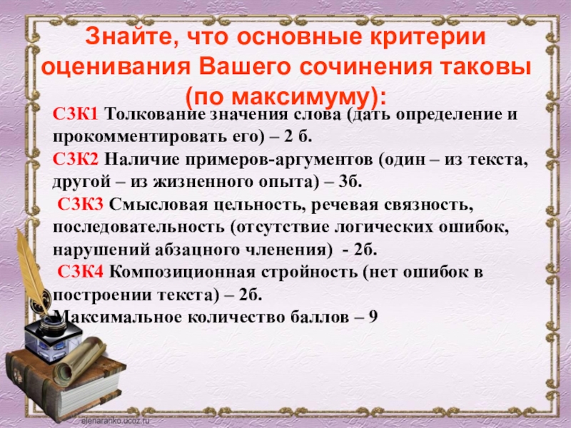Слайд 22Знайте, что основные критерии оценивания Вашего сочинения таковы (по максимуму):