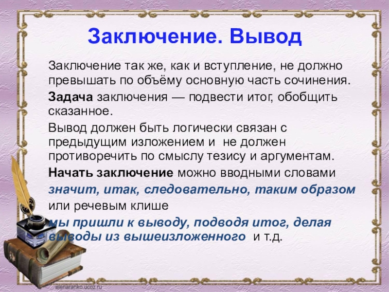 Вывод должен быть логически связан с предыдущим изложением и не должен противоречить по смыслу тезису и аргументам.