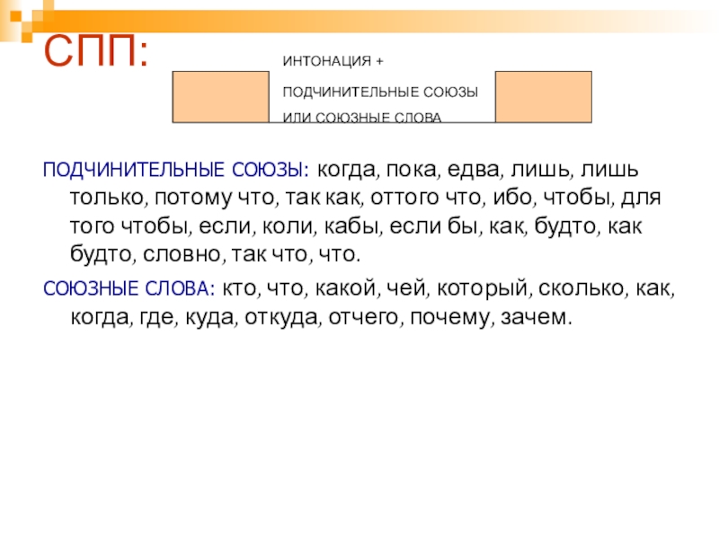 ПОДЧИНИТЕЛЬНЫЕ СОЮЗЫ: когда, пока, едва, лишь, лишь только, потому что, так как, оттого что, ибо, чтобы, для того чтобы, если, коли, кабы, если бы, как, будто, как будто, словно, так что, что.