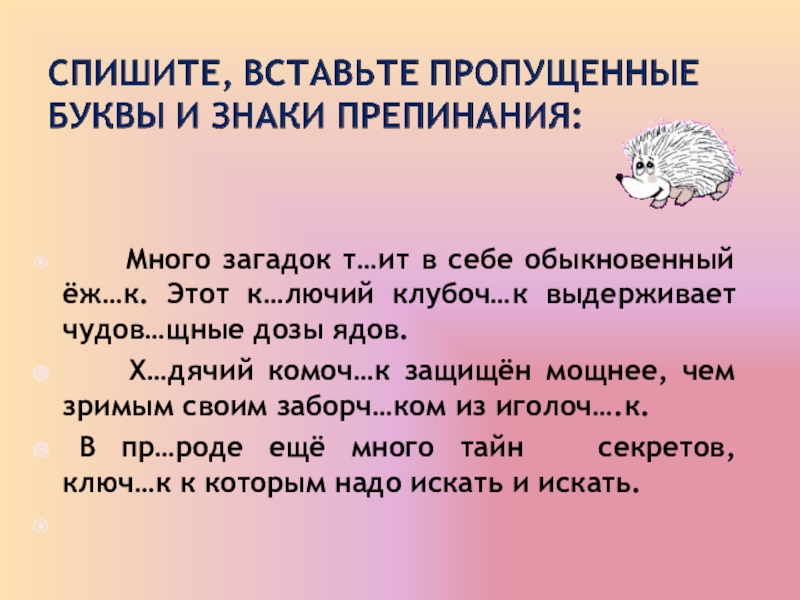 Слайд 24 Много загадок т…ит в себе обыкновенный ёж…к. Этот