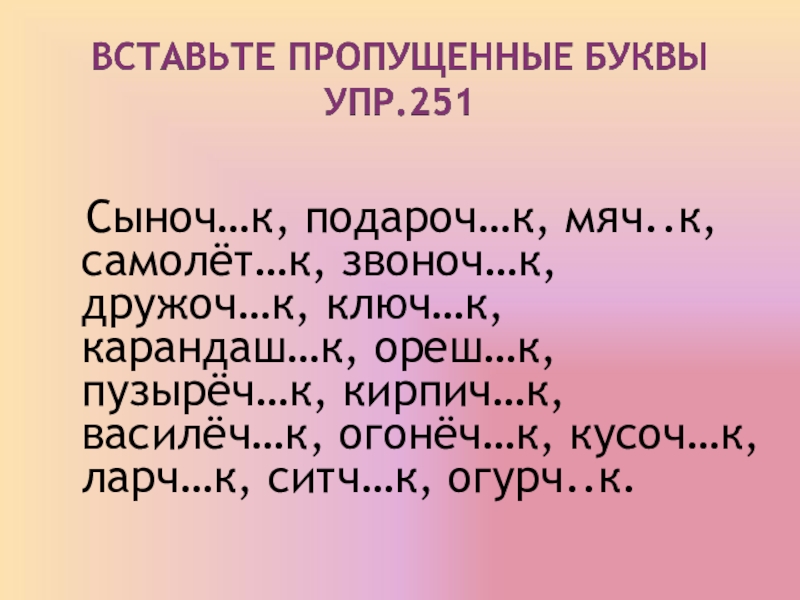 Слайд 10 Сыноч…к, подароч…к, мяч..к, самолёт…к, звоноч…к, дружоч…к, ключ…к, карандаш…к, ореш…к, пузырёч…к,