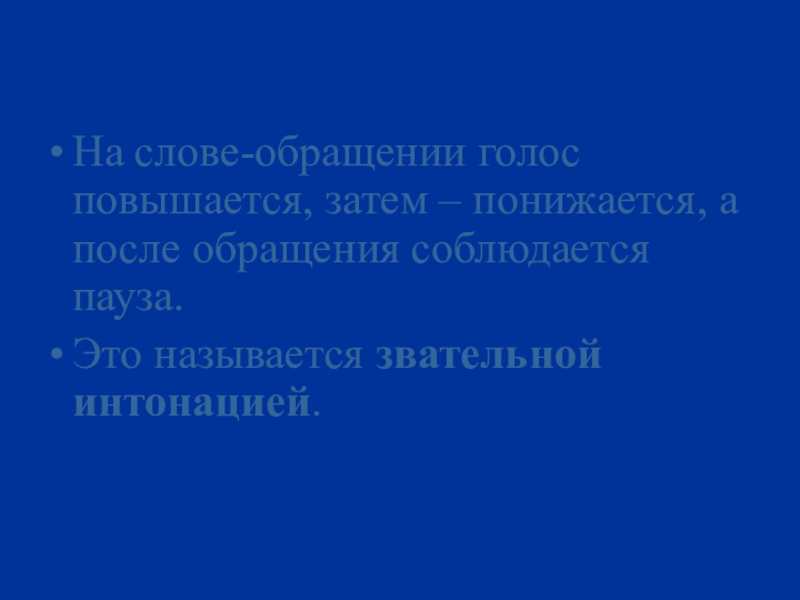 Слайд 6На слове-обращении голос повышается, затем – понижается, а после обращения соблюдается