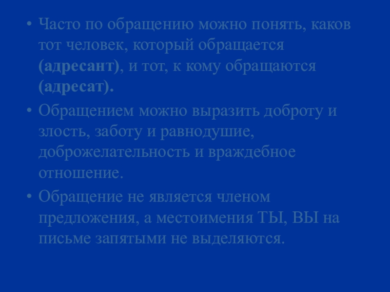 Обращением можно выразить доброту и злость, заботу и равнодушие, доброжелательность и враждебное отношение.