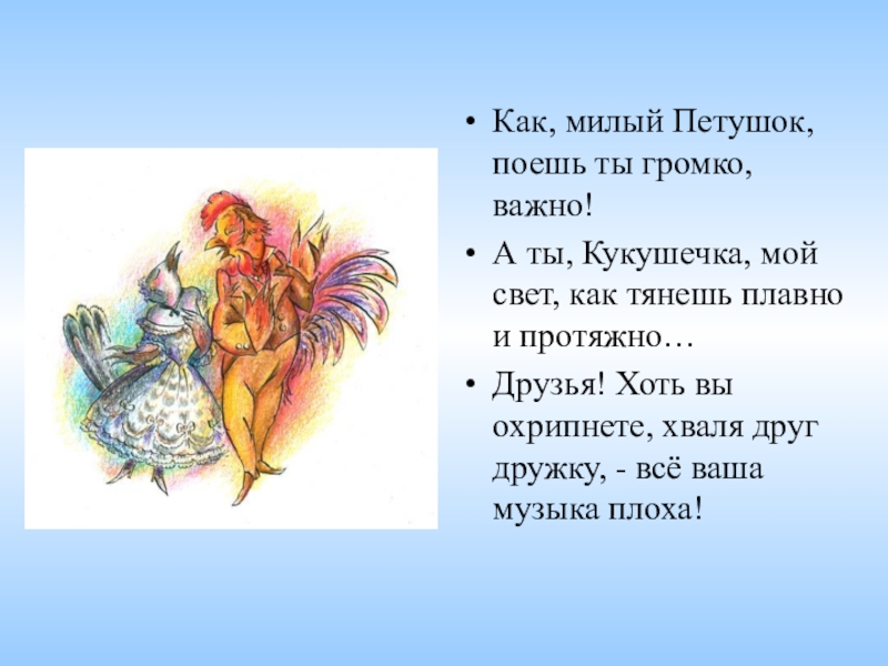 Слайд 13Как, милый Петушок, поешь ты громко, важно!