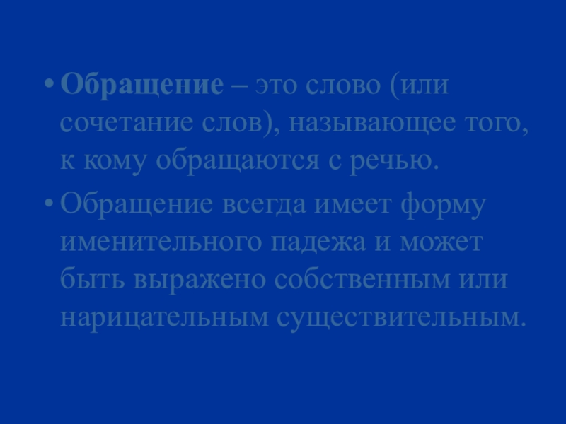 Обращение всегда имеет форму именительного падежа и может быть выражено собственным или нарицательным существительным.