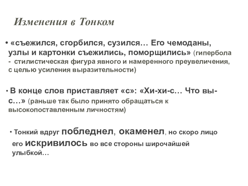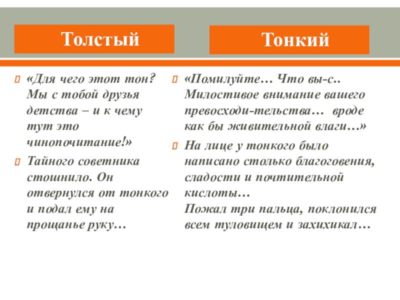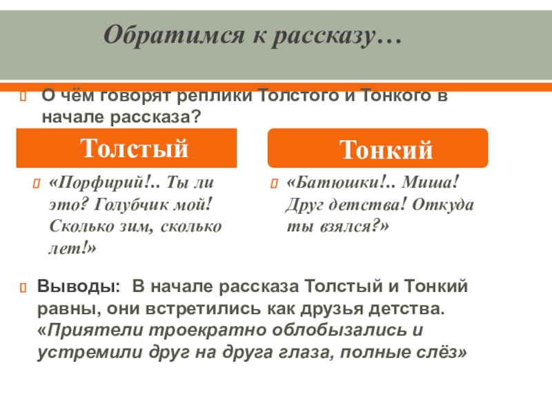 Выводы: В начале рассказа Толстый и Тонкий равны, они встретились как друзья детства. «Приятели троекратно облобызались и устремили друг на друга глаза, полные слёз»