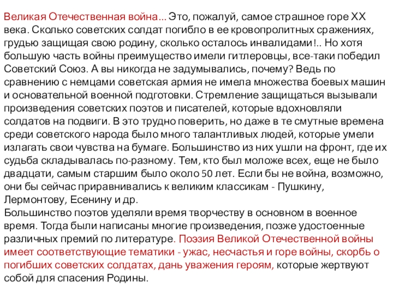 советских солдат погибло в ее кровопролитных сражениях, грудью защищая свою родину, сколько осталось инвалидами!.. Но хотя большую часть войны преимущество имели гитлеровцы, все-таки победил Советский Союз. А вы никогда не задумывались, почему? Ведь по сравнению с немцами советская армия не имела множества боевых машин и основательной военной подготовки. Стремление защищаться вызывали произведения советских поэтов и писателей, которые вдохновляли солдатов на подвиги. В это трудно поверить, но даже в те смутные времена среди советского народа было много талантливых людей, которые умели излагать свои чувства на бумаге. Большинство из них ушли на фронт, где их судьба складывалась по-разному. Тем, кто был моложе всех, еще не было двадцати, самым старшим было около 50 лет. Если бы не война, возможно, они бы сейчас приравнивались к великим классикам - Пушкину, Лермонтову, Есенину и др.