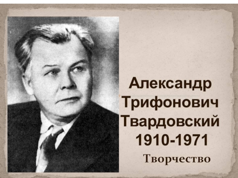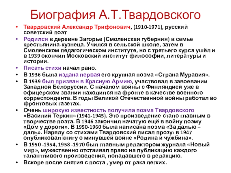 Биография А.Т.ТвардовскогоТвардовский Александр Трифонович, (1910-1971), русский советский поэтРодился в деревне Загорье (Смоленская губерния) в семье крестьянина-кузнеца. Учился