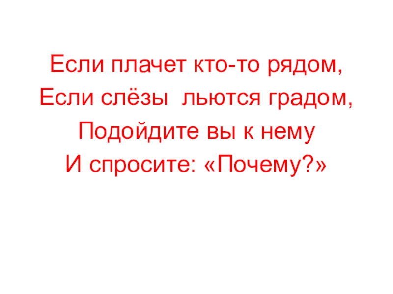 Если плачет кто-то рядом, Если слёзы льются градом, Подойдите вы к немуИ спросите: «Почему?»