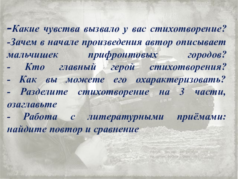-Какие чувства вызвало у вас стихотворение? -Зачем в начале произведения автор описывает мальчишек прифронтовых городов?  -