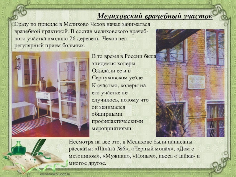 Несмотря на все это, в Мелихове были написаны рассказы: «Палата №6», «Черный монах», «Дом с мезонином», «Мужики», «Ионыч», пьеса «Чайка» и многое другое.