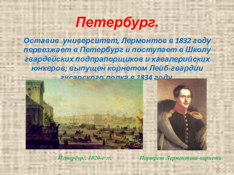 Оставив университет, Лермонтов в 1832 году переезжает в Петербург и поступает