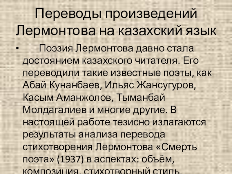 читателя. Его переводили такие известные поэты, как Абай Кунанбаев, Ильяс Жансугуров, Касым Аманжолов, Тыманбай Молдагалиев и многие другие. В настоящей работе тезисно излагаются результаты анализа перевода стихотворения Лермонтова «Смерть поэта» (1937) в аспектах: объём, композиция, стихотворный стиль.