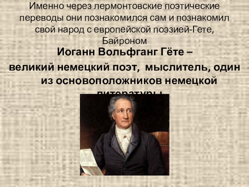 Слайд 14Именно через лермонтовские поэтические переводы они познакомился сам и познакомил свой